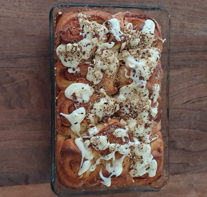 Wir haben die Cinnamon Rolls mit einer leichten Butter Cream und gerösteten Haselnüssen garniert.